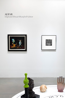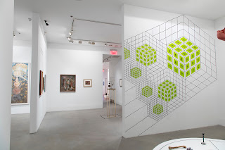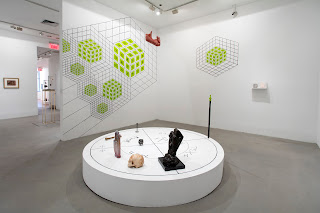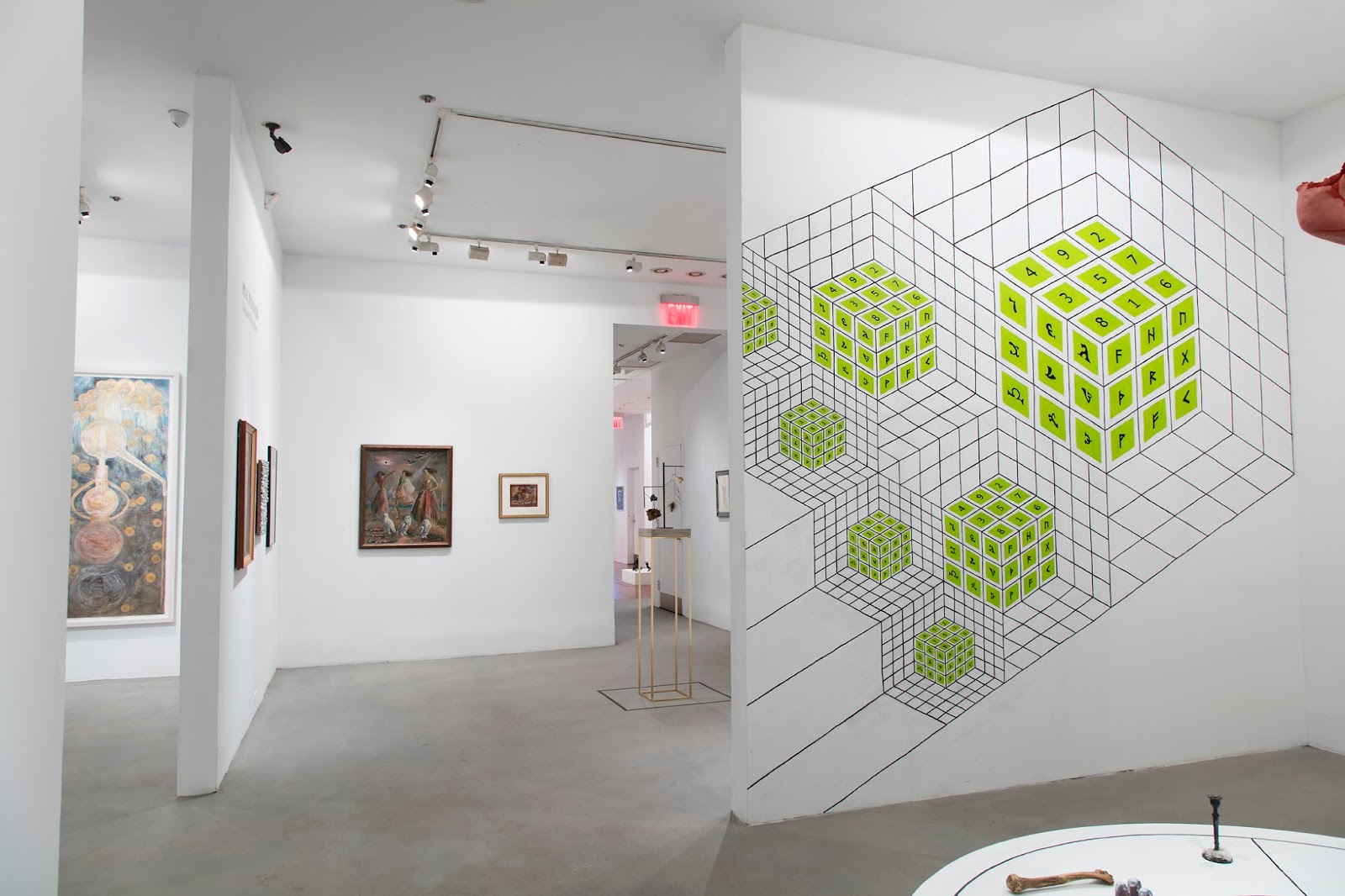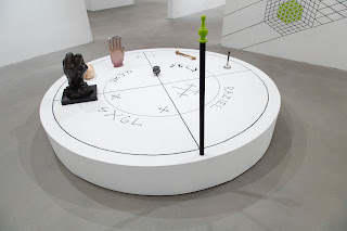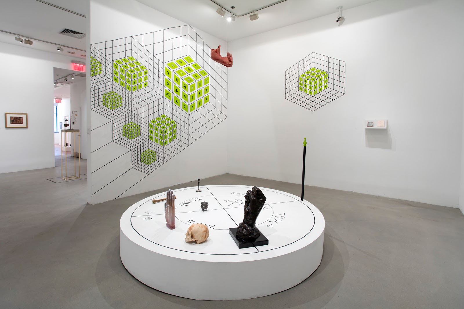 Jesse Bransford, (This and below) Installation views of The Emerald Tablet ( for The Magic Flute), 2015 Dimensions variable, Graphite and latex paint on wall, and Circle to the Four Corners/Elements ( for K.S.), 2015-16, Dimensions variable / site specific installation, Graphite and latex paint, skull, humerus, brass candlestick, cast iron cauldron, sculpture Mandroglorie and sculpture FIST on circular platform, Courtesy of the artist, Rebecca Salmon and Weinstein Gallery. Installation at 80WSE, New York (Destroyed)